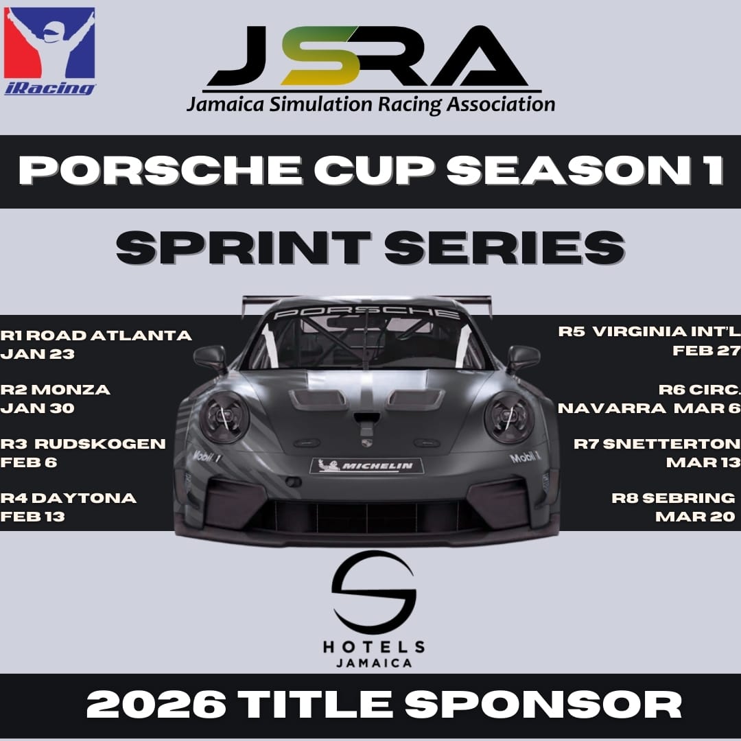 The Porsche Cup will feature eight rounds contested in a sprint race format, bringing fast-paced, highly competitive virtual circuit racing to Jamaica’s growing sim racing community. The championship is proudly sponsored by S Hotels Jamaica, underscoring continued corporate support for both motorsport and emerging digital racing disciplines.